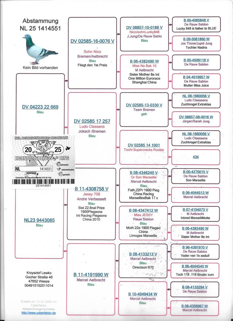 SAMCZYK WYWODZĄCY SIĘ Z WYBITNYCH GOŁĘBI LOTOWYCH I ROZPŁODOWYCH → JEST ON SYNEM ROZPŁODOWCA “526” ORG. HARTMUT WILL - WNUK DWÓCH WYBITNYCH LOTNIKÓW: “520” PRANGE - 7X 1 KONK. / “178” (SYN “PRANGE 864” X “PUTTMANN 1376”) | WNUK SAMCA “769” (SYN “SAFIER” X INBRED “OLYMPIADE 003) | WNUK SAMICY “968" …