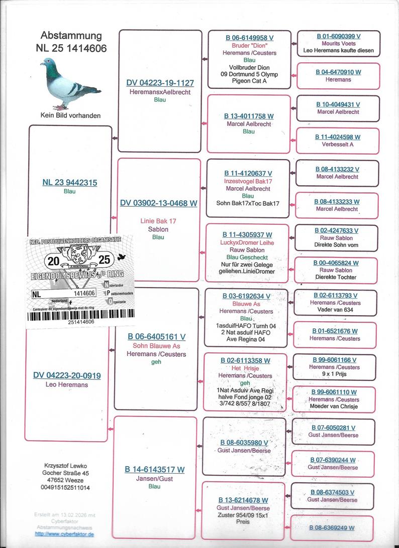 WNUCZKA SAMICY “468” THEO LEHNEN (LINIA BAK 17) - JEST ONA BABCIĄ OLIMPIJCZYKA “OLIMPIC CARL" - DV-09205-21-594 ORAZ PRABABCIĄ OLIMPIJKI “OLIMPIC DESIRE" - DV-09205-23-1279 | WNUCZKA “6405161” HEREMANS & CEUSTERS (SYN WYBITNEGO LOTNIKA “BLAUWE AS 634”) | CÓRKA SAMICY “919” - JEST ONA WNUCZKĄ DWÓCH WYBITNYCH LOTNIKÓW HODOWLI HEREMANS & CEUSTERS → “BLAUWE AS” X “HET HRISJE”