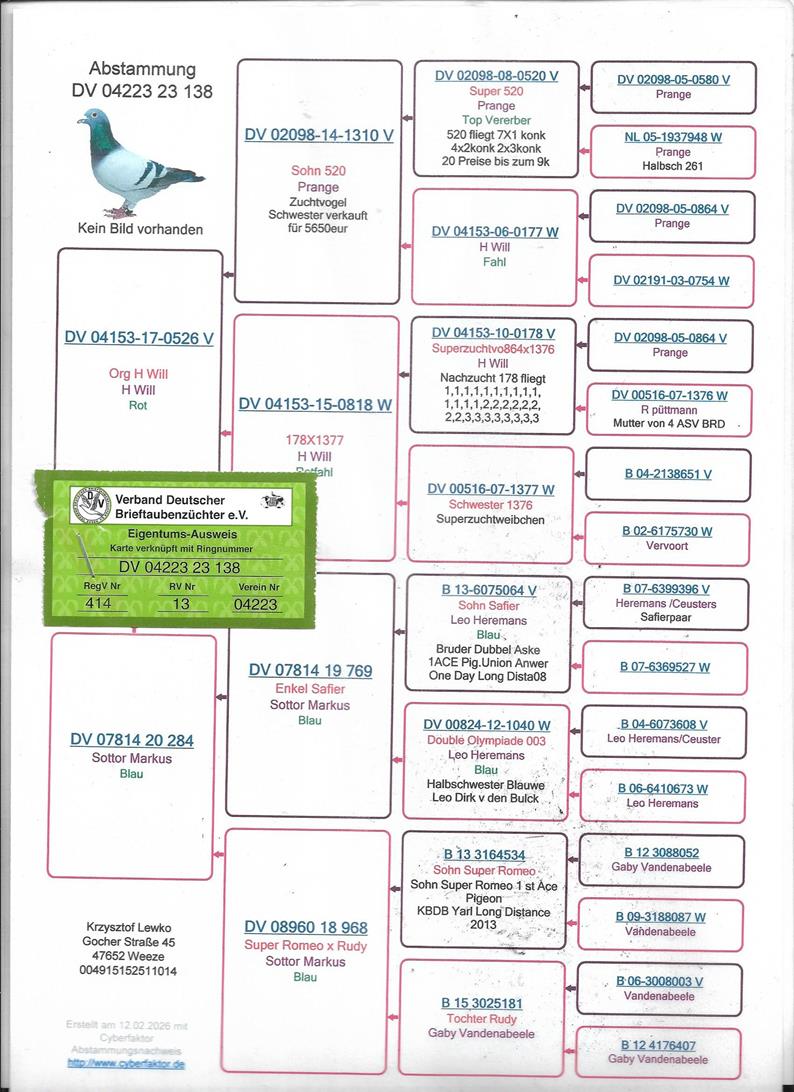 SAMCZYK WYWODZĄCY SIĘ Z WYBITNYCH GOŁĘBI LOTOWYCH I ROZPŁODOWYCH → JEST ON SYNEM ROZPŁODOWCA “526” ORG. HARTMUT WILL - WNUK DWÓCH WYBITNYCH LOTNIKÓW: “520” PRANGE - 7X 1 KONK. / “178” (SYN “PRANGE 864” X “PUTTMANN 1376”) | WNUK SAMCA “769” (SYN “SAFIER” X INBRED “OLYMPIADE 003) | WNUK SAMICY “968" - 100% G. VANDENABEELE - WNUCZKA “SUPER ROMEO” / WNUCZKA “RUDY” !!