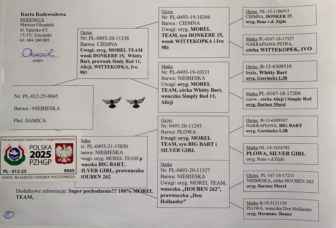 100% MOREL TEAM | CÓRKA SAMCA ROZPŁODOWEGO “11472” ORG. MOREL TEAM - WNUK WSPANIAŁEJ LOTNICZKI “PANAMERA” - 2 AS POLSKI KAT. SPORT G | WNUCZKA SAMICY ROZPŁODOWEJ “4722” (WNUCZKA HOUBEN 262) - JEST ONA CÓRKĄ “CHICAGO” (OSTATNI SYN BAZOWEGO “HOUBEN 262”) | WNUCZKA ROZPŁODOWCA “1154871” ORG. THIBAUT- …