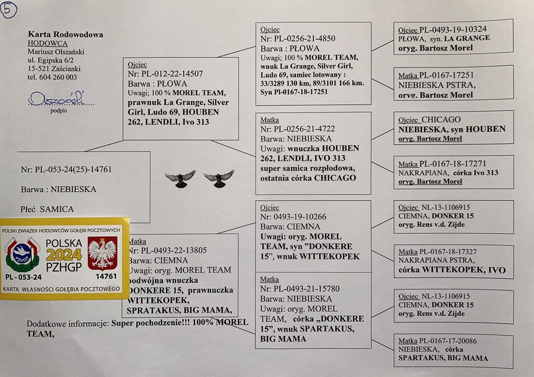 100% MOREL TEAM | CÓRKA SAMCA ROZPŁODOWEGO “11472” ORG. MOREL TEAM - WNUK WSPANIAŁEJ LOTNICZKI “PANAMERA” - 2 AS POLSKI KAT. SPORT G | WNUCZKA SAMICY ROZPŁODOWEJ “4722” (WNUCZKA HOUBEN 262) - JEST ONA CÓRKĄ “CHICAGO” (OSTATNI SYN BAZOWEGO “HOUBEN 262”) | WNUCZKA ROZPŁODOWCA “1154871” ORG. THIBAUT- …