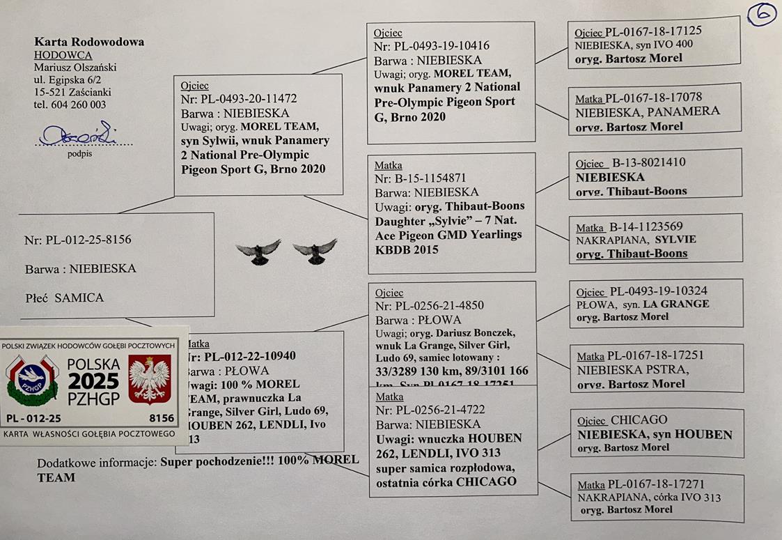 100% MOREL TEAM | CÓRKA SAMCA ROZPŁODOWEGO “11472” ORG. MOREL TEAM - WNUK WSPANIAŁEJ LOTNICZKI “PANAMERA” - 2 AS POLSKI KAT. SPORT G | WNUCZKA SAMICY ROZPŁODOWEJ “4722” (WNUCZKA HOUBEN 262) - JEST ONA CÓRKĄ “CHICAGO” (OSTATNI SYN BAZOWEGO “HOUBEN 262”) | WNUCZKA ROZPŁODOWCA “1154871” ORG. THIBAUT- …