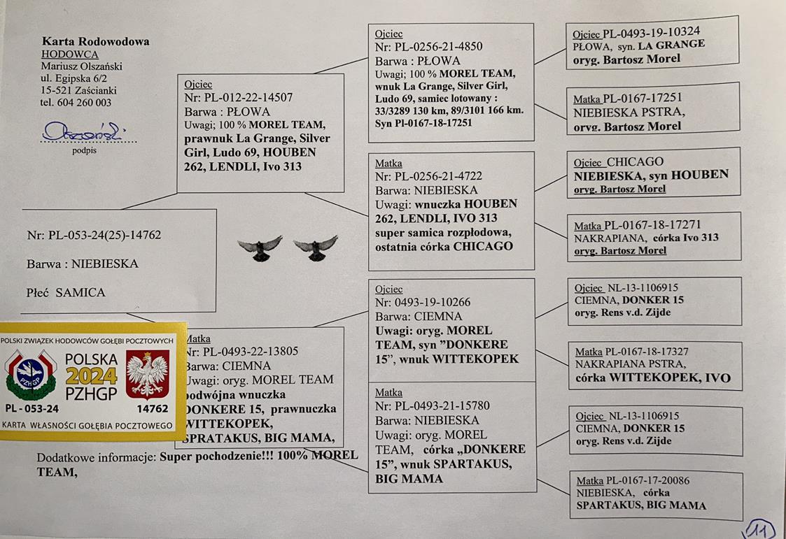 100% MOREL TEAM | CÓRKA SAMCA ROZPŁODOWEGO “11472” ORG. MOREL TEAM - WNUK WSPANIAŁEJ LOTNICZKI “PANAMERA” - 2 AS POLSKI KAT. SPORT G | WNUCZKA SAMICY ROZPŁODOWEJ “4722” (WNUCZKA HOUBEN 262) - JEST ONA CÓRKĄ “CHICAGO” (OSTATNI SYN BAZOWEGO “HOUBEN 262”) | WNUCZKA ROZPŁODOWCA “1154871” ORG. THIBAUT- …