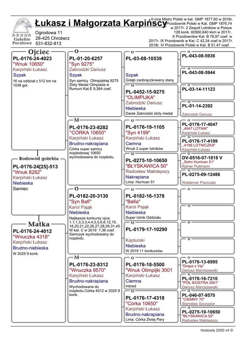 SYN SUPER LOTNICZKI 8096 → 3 AS ROCZNA LOTNICZKA ODDZIAŁU PIŃCZÓW 2024 (8 KONK) / W SEZONIE 2025 ZDOBYŁA 9 KONK. → WYWODZI SIĘ Z DWÓCH BAZOWYCH PAR HODOWLI / JEST WNUCZKĄ PARY NR 2 (SUMO 3331 X DRAPKA 1684) !! | SYN SAMCZYKA 4028 → W SEZONIE 2025 JAKO ROCZNY M.IN.: 5/ 2573 SZT - 238KM !! / 42/ 275 …